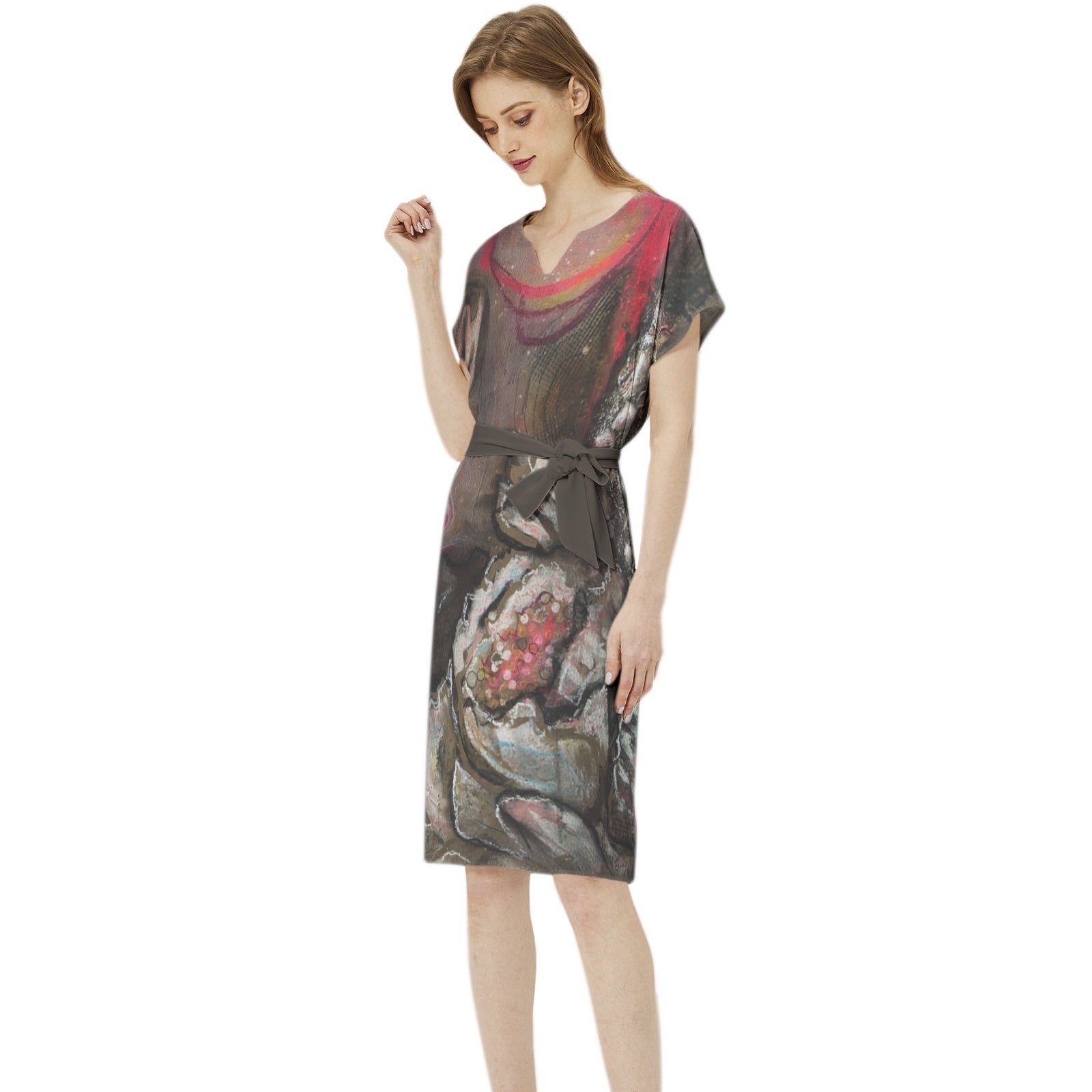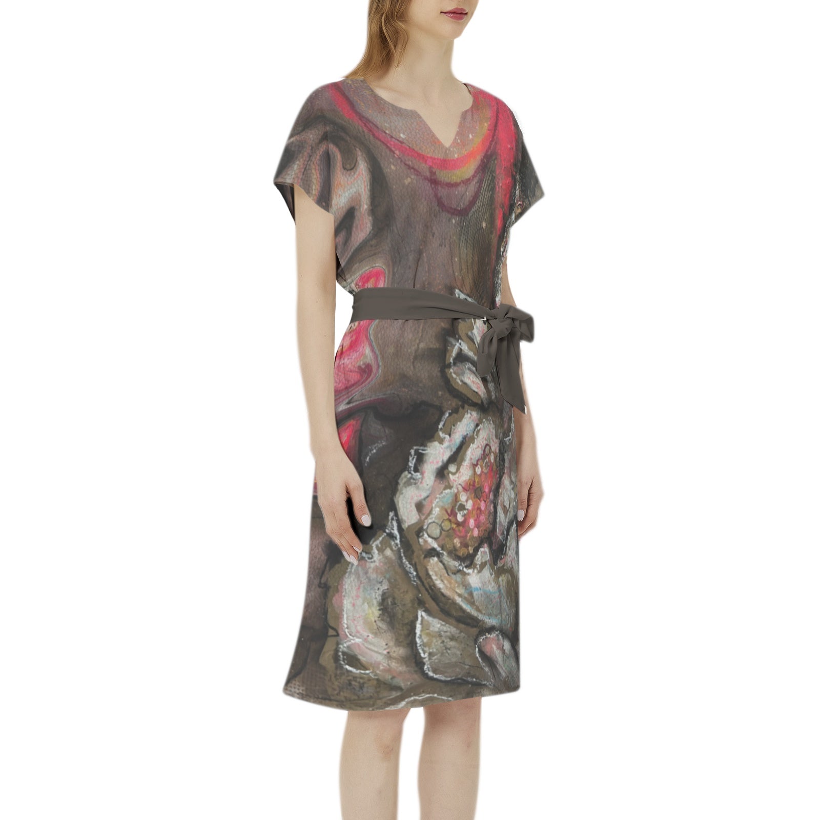 Manches chauve-souris, col cranté, ceinture à nouer à la taille, ourlet droit, tunique, robe décontractée